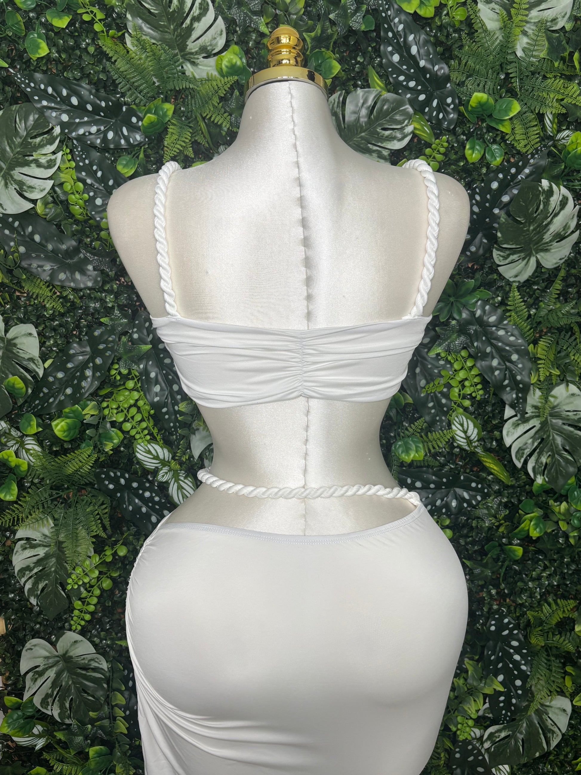 This stunning two-piece set features a sleek white bandeau top with twisted rope detailing along the straps and bustline, adding a nautical touch to its flirty silhouette. The matching high-waisted skirt hugs your curves with a smooth, ruched finish, while the coordinating rope belt wraps around the waist for a bold, statement look. Perfect for vacation vibes, yacht parties, or tropical getaways, this set brings effortless elegance with a playful twist.