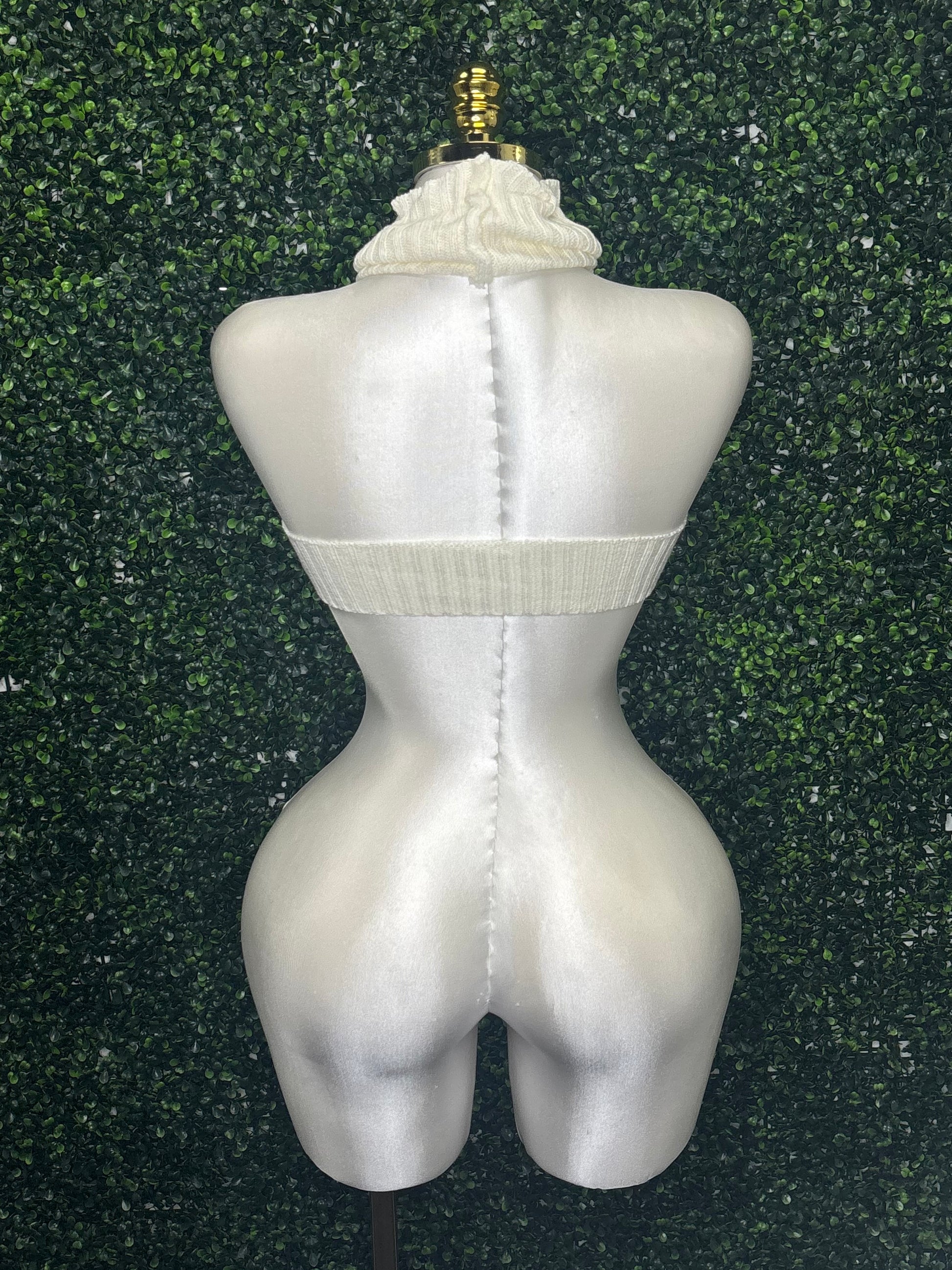 Elevate your wardrobe with the Ivory Halter-Top. This statement piece features a soft, ribbed knit texture in a creamy ivory hue that hugs your curves in all the right places. The dramatic high neckline adds a touch of elegance, while the asymmetrical, sculpted hem creates a striking silhouette that’s both edgy and feminine. Perfect for layering or standing alone, this Halter-Top is your new go-to for turning heads from brunch to date night.