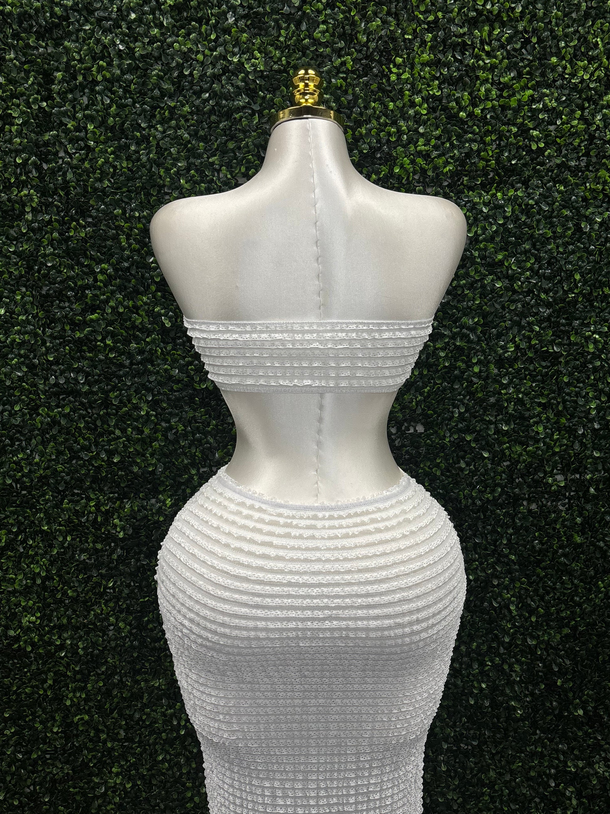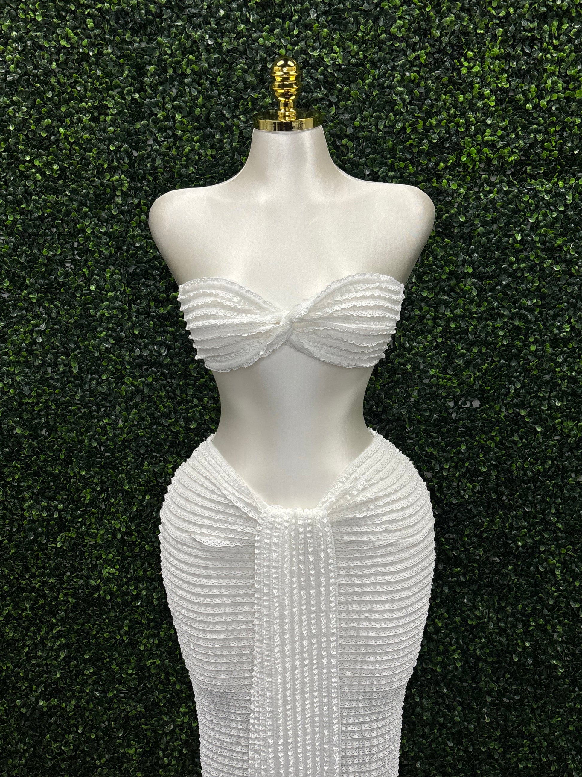 Turn heads in our Soleada set — a stunning two-piece. This textured bandeau top pairs perfectly with the high-waisted skirt, featuring a figure-hugging fit and a dramatic draped panel that brings effortless elegance. Made in a stretchy fabric with a tropical twist, it’s perfect for beachside brunches, vacation nights, or Miami moments under the sun.